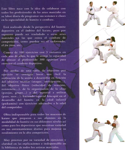 Un libro que encantará a los karatecas en especial: Kumite. Entrenamiento (Alas, 2010), de Manuel Capetillo. Es encomiable que la editorial decana de los libros de AA.MM. y Deportes de Contacto continúe sacando títulos interesantes para los amantes de la lectura. Este libro nace con la idea de colaborar con todos los profesionales de las artes marciales en su labor diaria de programar sus sesiones o clases en la especialidad de kumite o combate deportivo (Shiai Kumite) en el ámbito del karate. Consta de 100 ejercicios con 3 variantes en cada uno de ellos, lo que le otorga la capacidad de ofrecer al profesorado 300 opciones para entrenar el combate deportivo. Por medio de una tabla de objetivos por ejercicio se consigue hacer más fácil la realización de la sesión a desarrollar en función del objetivo técnico (ataque, anticipación…), del objetivo físico (velocidad de reacción, resistencia…), de la organización de la clase (parejas, grupo…) y del material a utilizar (paos, saco…), haciendo especial hincapié en el desarrollo del kumite en la edad infantil (prekumite) con ejercicios adecuados a la edad del competidor. Obra indispensable para todos los maestros de karate que preparan a sus alumnos en la modalidad de kumite en sus diferentes niveles así como para los deportistas que necesitan variedad en sus entrenamientos diarios para mejorar su rendimiento en la alta competición. Muy práctico por su variedad de ejercicios y claridad en las explicaciones. Te mostramos algunos lugares donde adquirirlo: